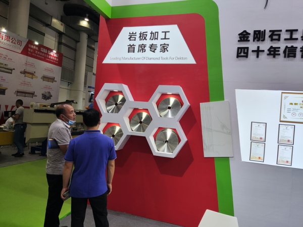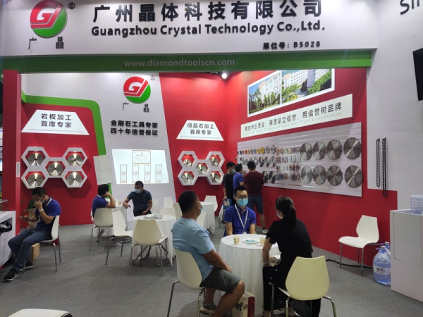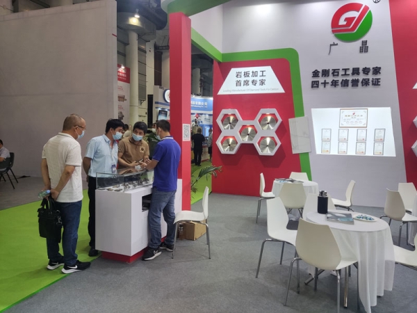依托巖板生產加工的行業大趨勢,廣晶公司作為巖板加工金剛石工具的領航者,在展會上展出了久經市場檢驗的經典巖板鋸片D350mm和斜切用鋸片D300mm,適配市場上的普通橋切機和五軸橋切機,用于生產加工企業的高效直切和精細斜切。同時推出配套工具如巖板/石英石用金剛石平磨頭、圓弧磨頭、金剛石鉆頭、金剛石磨邊輪等高質量產品,方便用戶進行一站式配套采購。在展會期間,巖板鋸片展區和平磨頭/圓弧磨頭展區吸引了大量的客戶駐足查看,詢價,也反映出了市場對公司產品的認可。