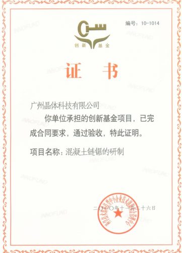 2011年3月,科學技術部科技型中小企業技術創新基金管理中心正式頒發我司承擔創新基金項目“混凝土鏈鋸的研制”的驗收證書,這意味著該項目已完成科學技術部科技型中心企業技術創新基金管理中心的合同要求,正式通過驗收。