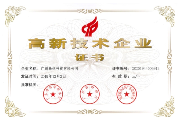 近日,廣州晶體科技有限公司收到了由廣東省科學技術廳、廣東省財政廳、國家稅務總局廣東省稅務局聯合頒發的“國家高新技術企業”證書,這是廣晶公司繼2016年獲得該項證書之后再次成功加入國家高新技術企業行列。