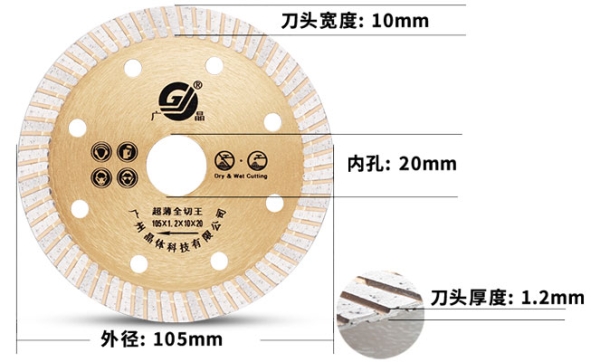 “廣晶”牌105mm超薄波紋加寬鋸片,連續邊燒結型, 適切各種裝修材料,安全、鋒利、切邊效果好。