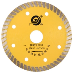 “廣晶”牌114mm超薄波紋加寬鋸片,連續(xù)邊燒結(jié)型,獨特的超薄波紋齒形設(shè)計,干切和濕切通用,全能切割陶瓷、石材、地板磚、仿古磚、玻璃、墻磚、石英石、混凝土、瀝青、耐火磚等硬脆性裝飾材料,具有切割面細膩整潔,切割邊崩邊小,鋒利度好,切割效率高,安全穩(wěn)定,性價比高等特點。 此系列超薄波紋加寬鋸片,全切王,是替代傳統(tǒng)的開口干切鋸片、連續(xù)式濕切鋸片的不二選擇。 如有任何詢問請與我們聯(lián)系。