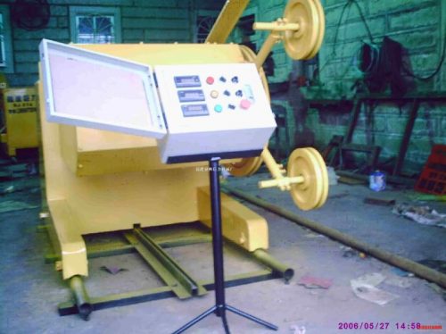 一般的輕便型混凝土繩鋸切割機由動力機構、進給機構、繩鋸儲放機構和移動機架四部分組成。驅動主飛輪,一般由電機直接驅動或用液壓馬達驅動。電機功率10 kW~15 kW,采用變頻調控,輸出線速度:2~30m/s。進給機構簡單的可以用手搖桿進給、液壓油缸進給或氣缸進給。儲放機構實際上是一對多槽飛輪,一個飛輪與驅動飛輪連接;另一個飛輪則為張緊輪,與進給機構連接。通過調節閥的壓力,控制油缸或氣缸的進給力以控制繩鋸工作過程金剛石串珠繩的張緊力,并保持恒定。機架是移動式的,帶有若干導向輪。通過導向輪輸出繩鋸,可以增加繩鋸在主飛輪上的包角,以提高繩鋸的鋸切力。整機重量150kg左右,搬運方便,非常適于地震災區樓房倒塌或混凝土構件壓埋人體的快速切割和疏導通道。